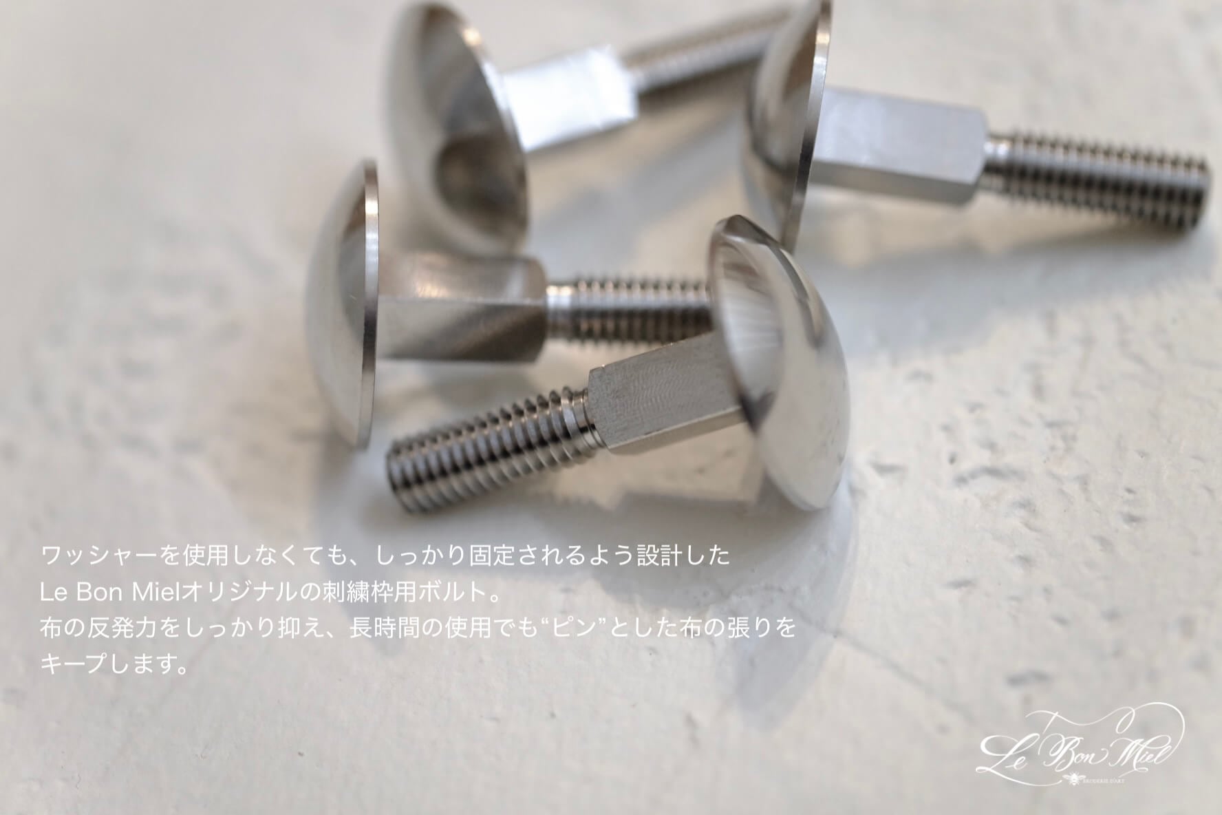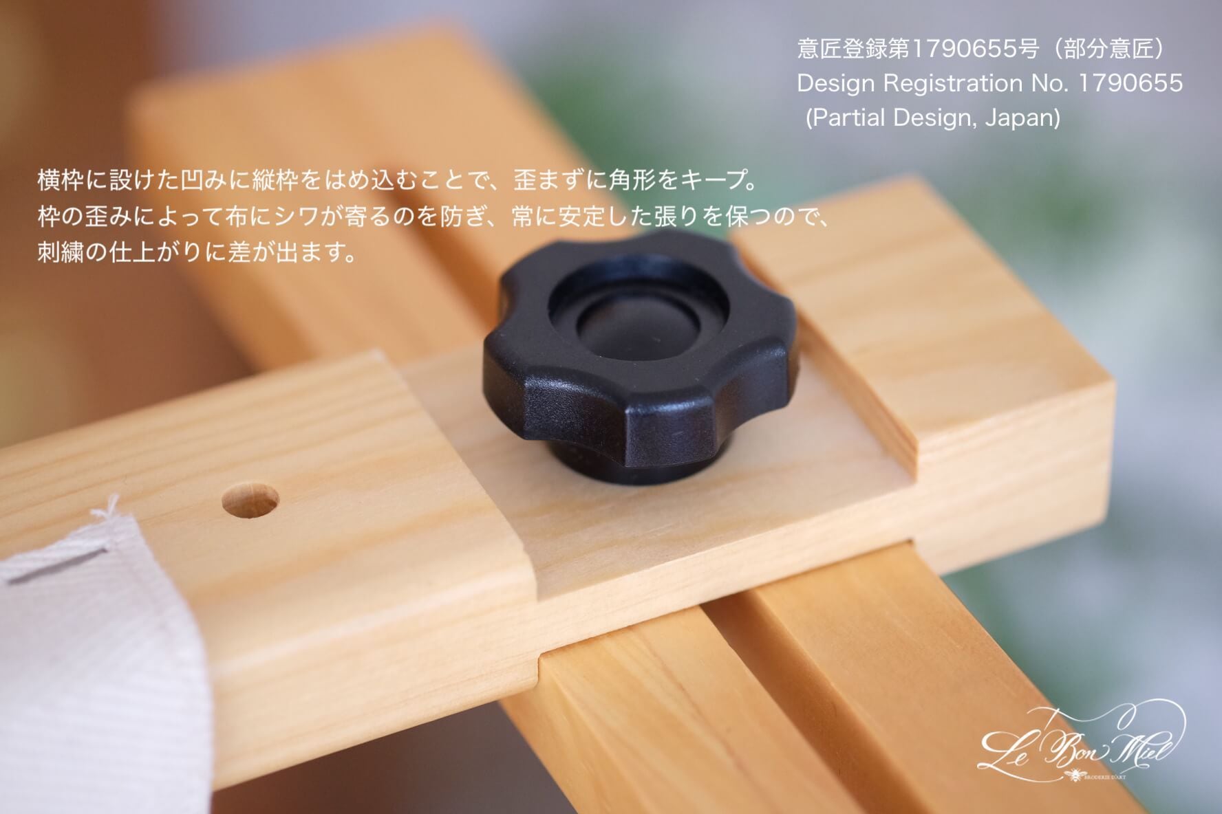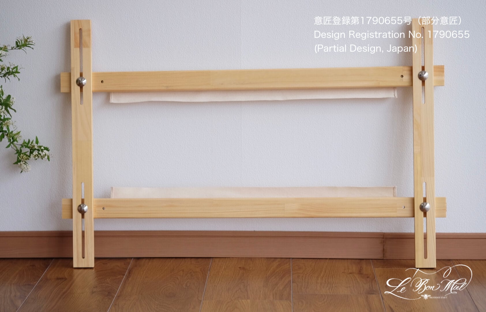 従来のリュネビル刺繍枠で生じやすい菱形の歪みを抑え、長尺の布張りもスムーズに行えるよう設計した、Le Bon Mielオリジナルの刺繍枠です。