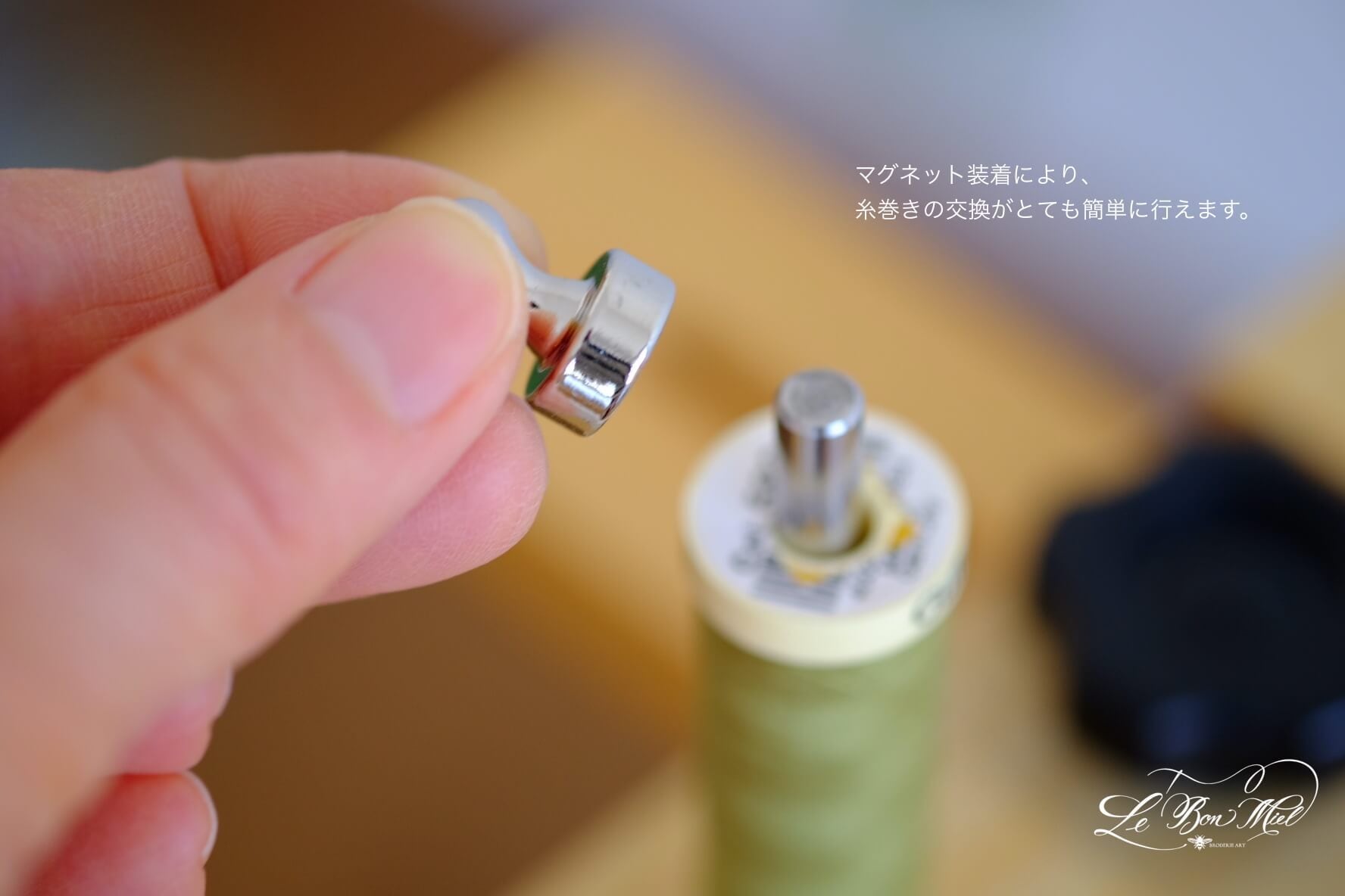 マグネットで本体上部に簡単着脱。糸巻き交換がとても簡単に行えます。
