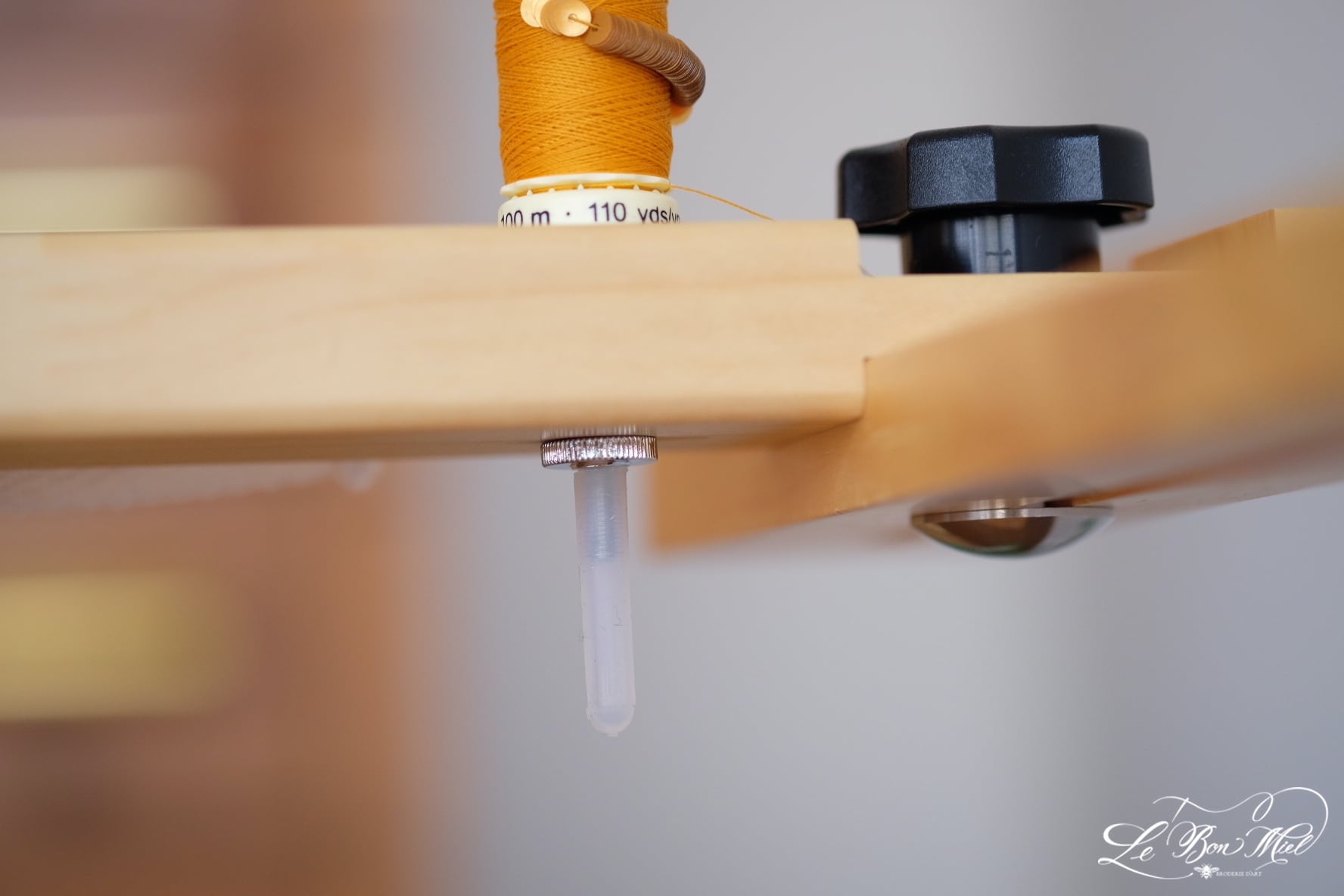 刺繍枠を裏返しても糸巻きが落ちないよう、固定パーツで糸巻きをしっかり保持。