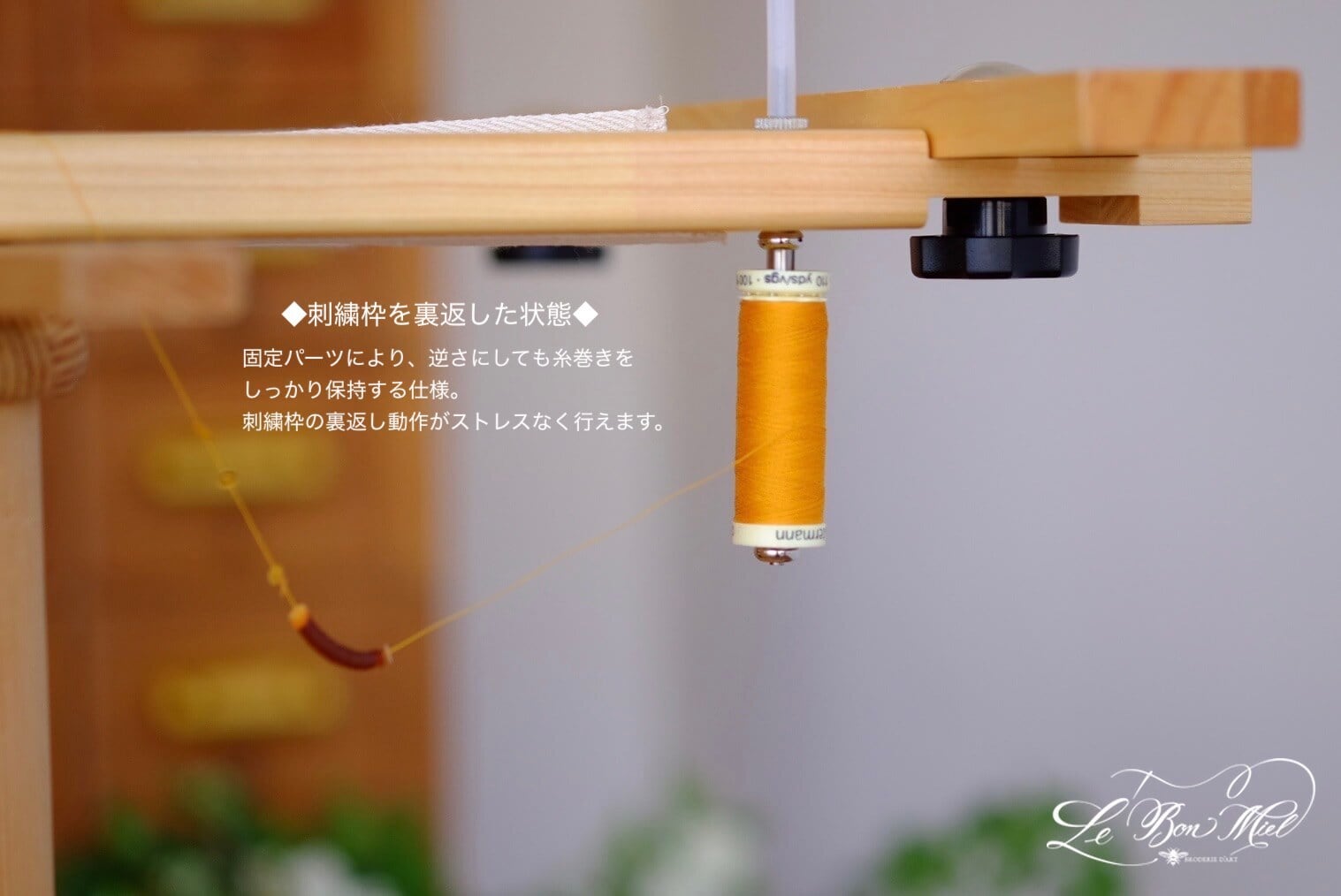 *本製品は、刺繍枠を裏返す際に糸巻きを取り外さずにご使用いただけるよう設計しておりますが、逆さにした状態での長時間の継続使用を前提としたものではございません。刺繍の仕上がりを確認する時などの一時的な反転作業でのご使用を想定しております。